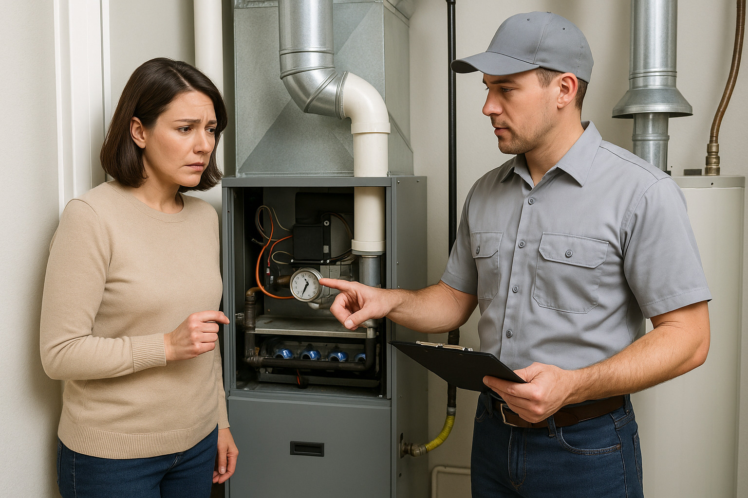 Homeowner and technician discussing gas furnace repair versus replacement in mechanical room.